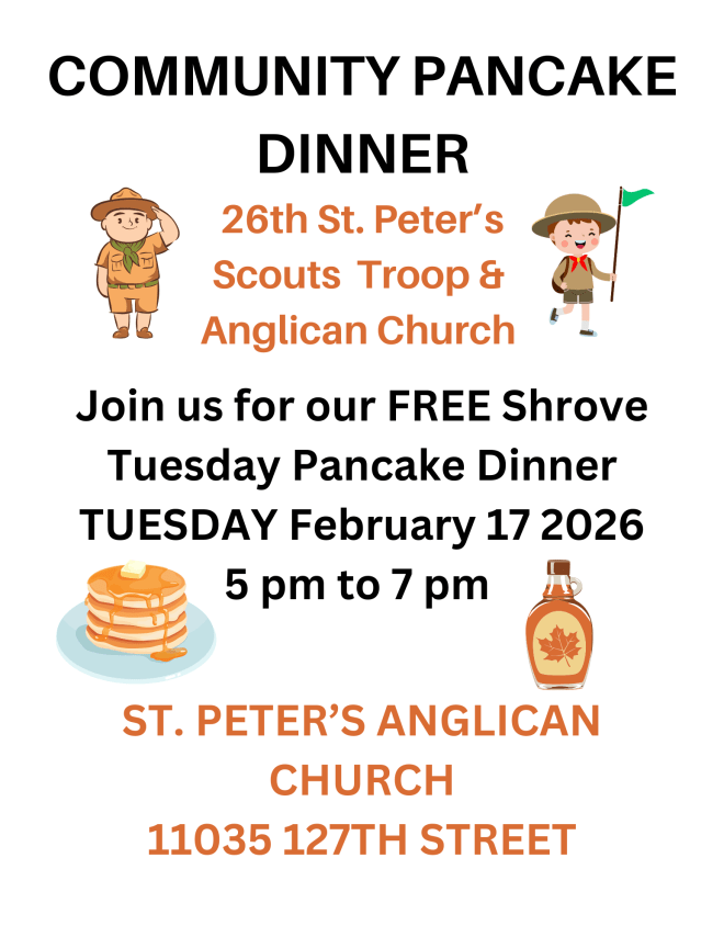 The Annual Meeting (AGM) of the parishioners of St. Peter’s Anglican Church Edmonton will he held on Sunday February 22, 2026 in the Upper Hall starting at 12:00PM. All baptized persons regularly attending Services of Worship at St Peter’s or otherwise regularly receiving the administrations of the clergy of this Parish are entitled to attend and vote. A zoom link will be provided, coffee and snacks will be available for in person attendees. For more information or to receive a zoom link please email your request to “stpeters.edm@gmail.com”